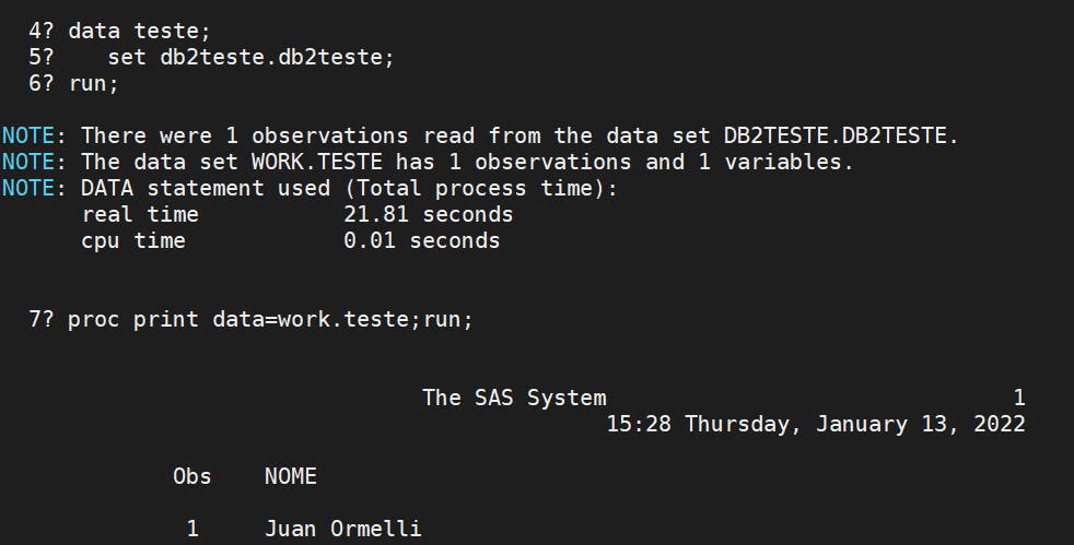 data teste; set db2teste.db2teste; run; proc print data=work.teste;run;