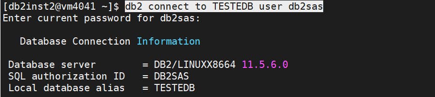 db2 connect to TESTEDB user db2sas