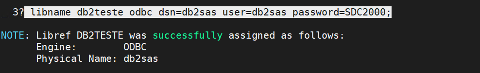 libname db2teste odbc dsn=db2sas user=db2sas password=SuaSenha;