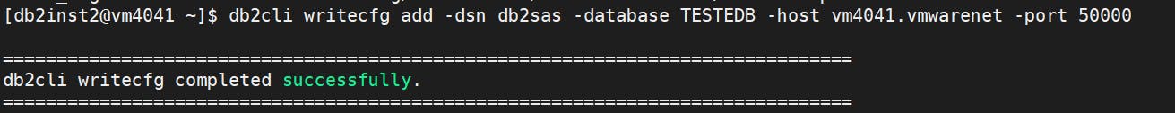 db2cli writecfg add -dsn db2sas -database TESTEDB -host vm4041.vmwarenet -port 50000